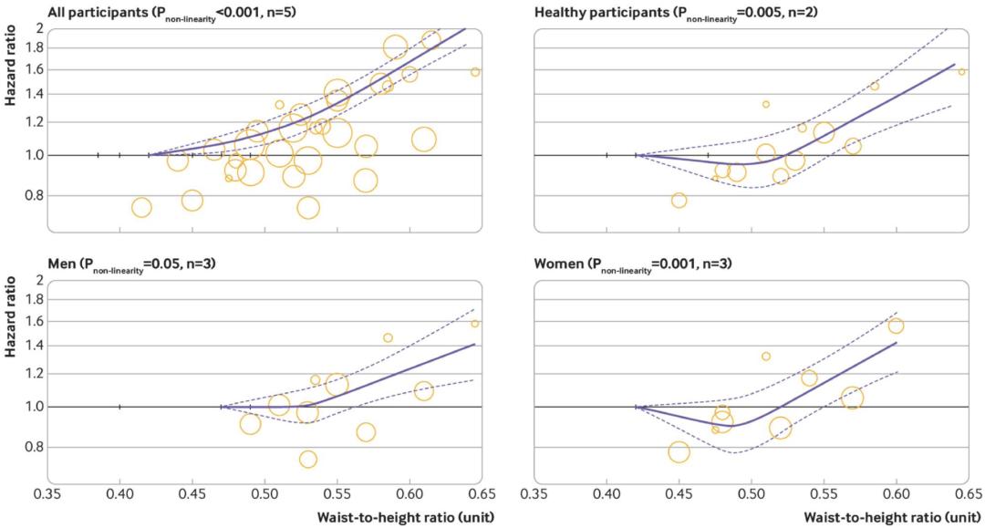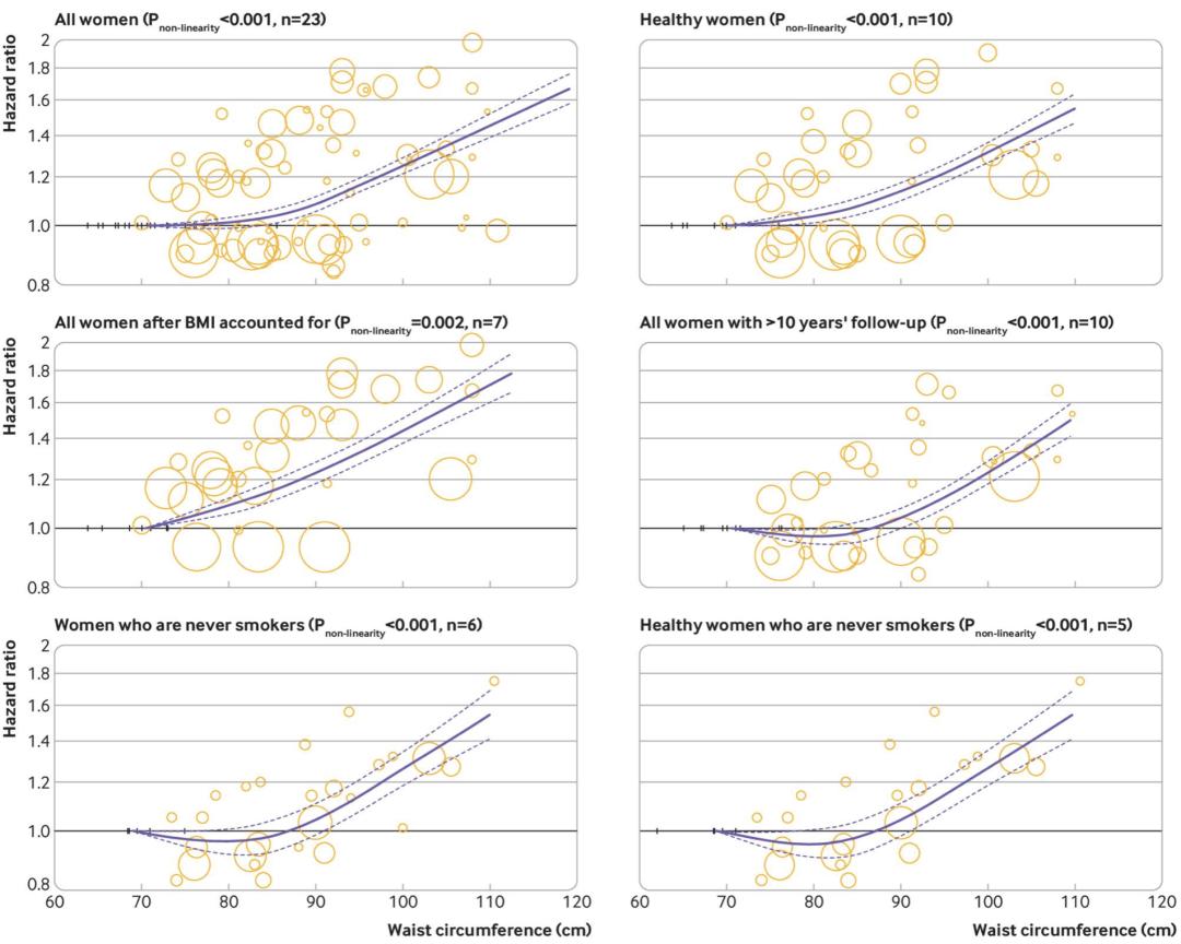 女性中腰围与死亡风险之间的关系腰臀比:腰臀比每增加0.1个单位,死亡风险增加20%,该关联在女性中更强。不过,非线性剂量反应分析中并未找到“转折点”,整个关系是单调的。