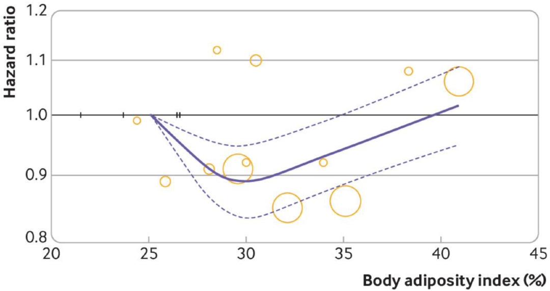 多项meta分析显示,在普通人群中,身体质量指数与全因死亡风险之间存在U型或J型关联,当BMI在22-23时死亡风险最低。由于BMI极易测量并可计算获得,因此常作为探究肥胖和死亡以及疾病关联的人体测量指标。