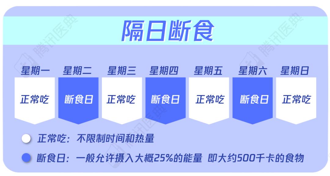 隔日断食法:简单来说就是一天吃,一天不吃。断食日一般允许摄入大概25%的能量,即大约500千卡的食物。