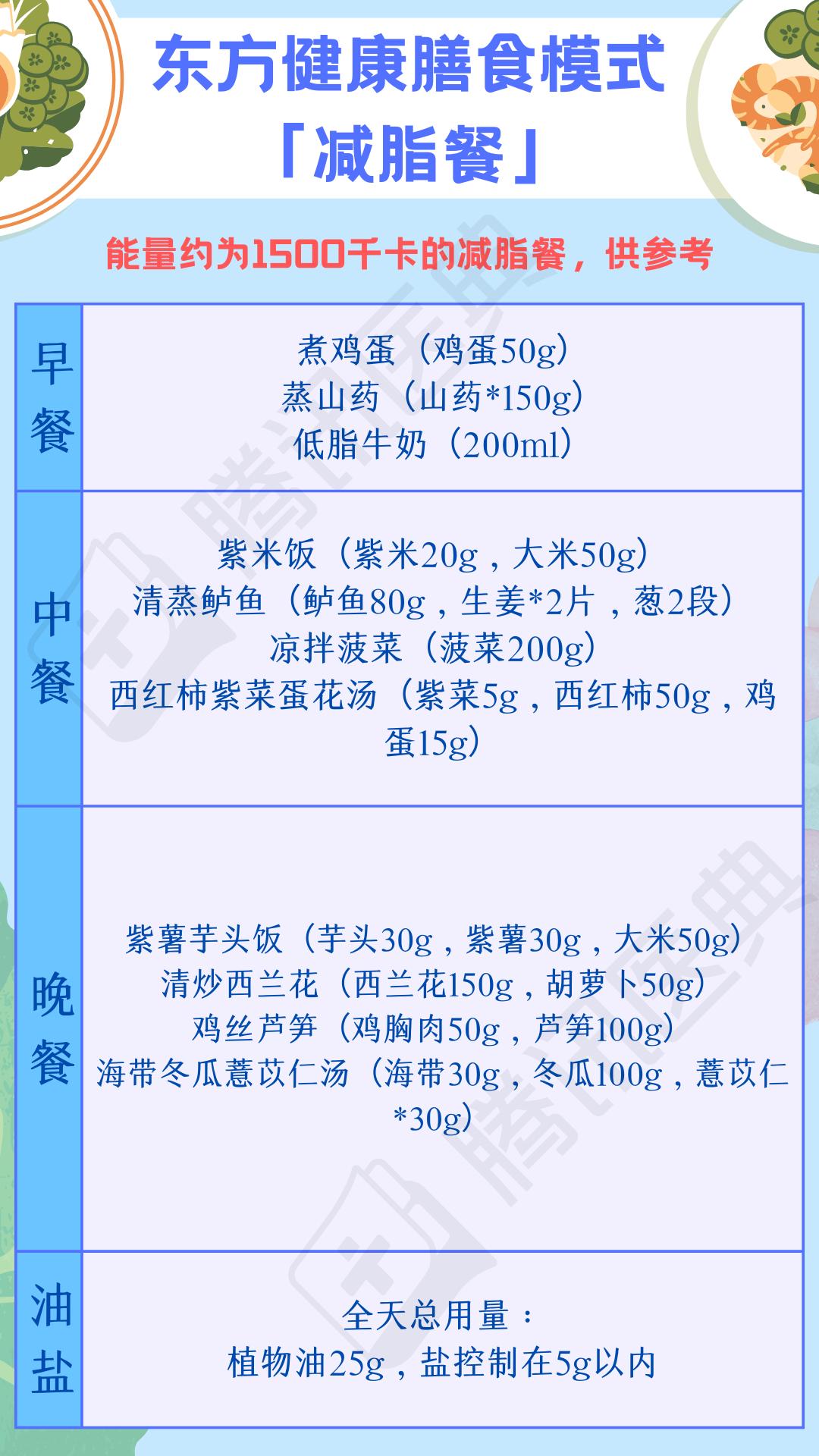 基于东方健康膳食模式,我们也贴心地准备了一份能量约为1500千卡的减脂餐,供大家参考: