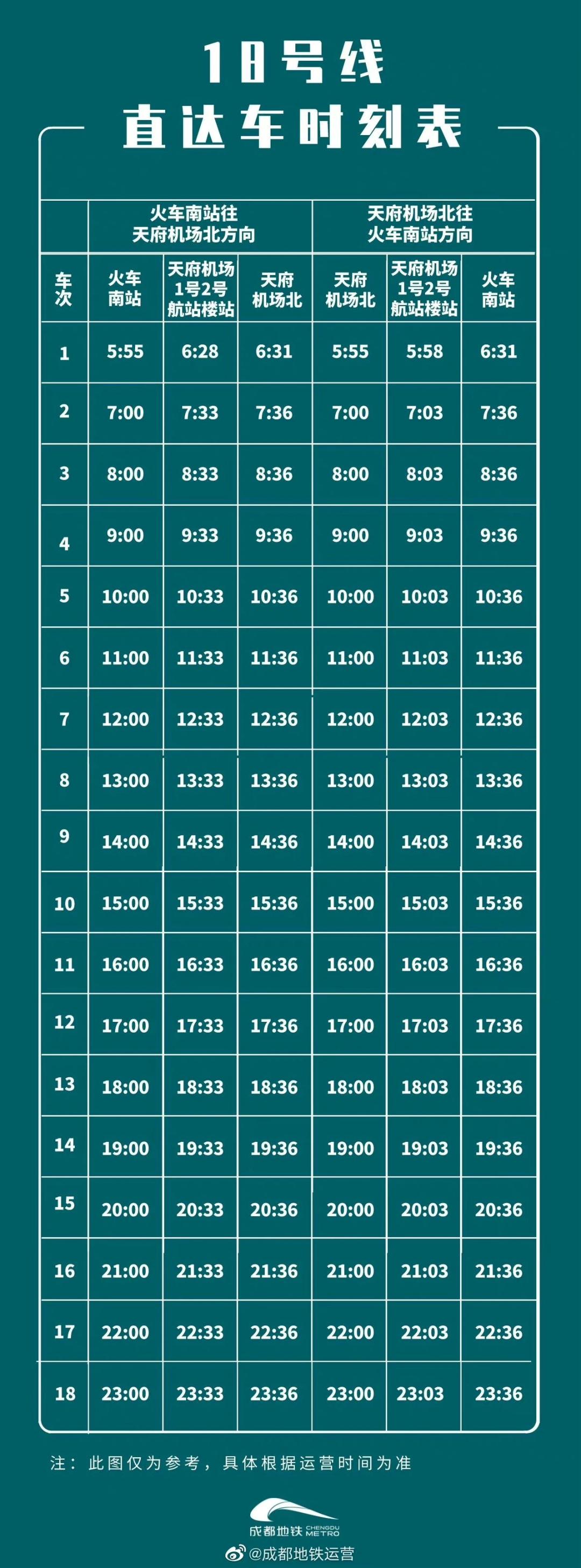 每日运营期间,成都地铁18号线将开行火车南站至天府机场1号2号航站楼站的双向直达列车。