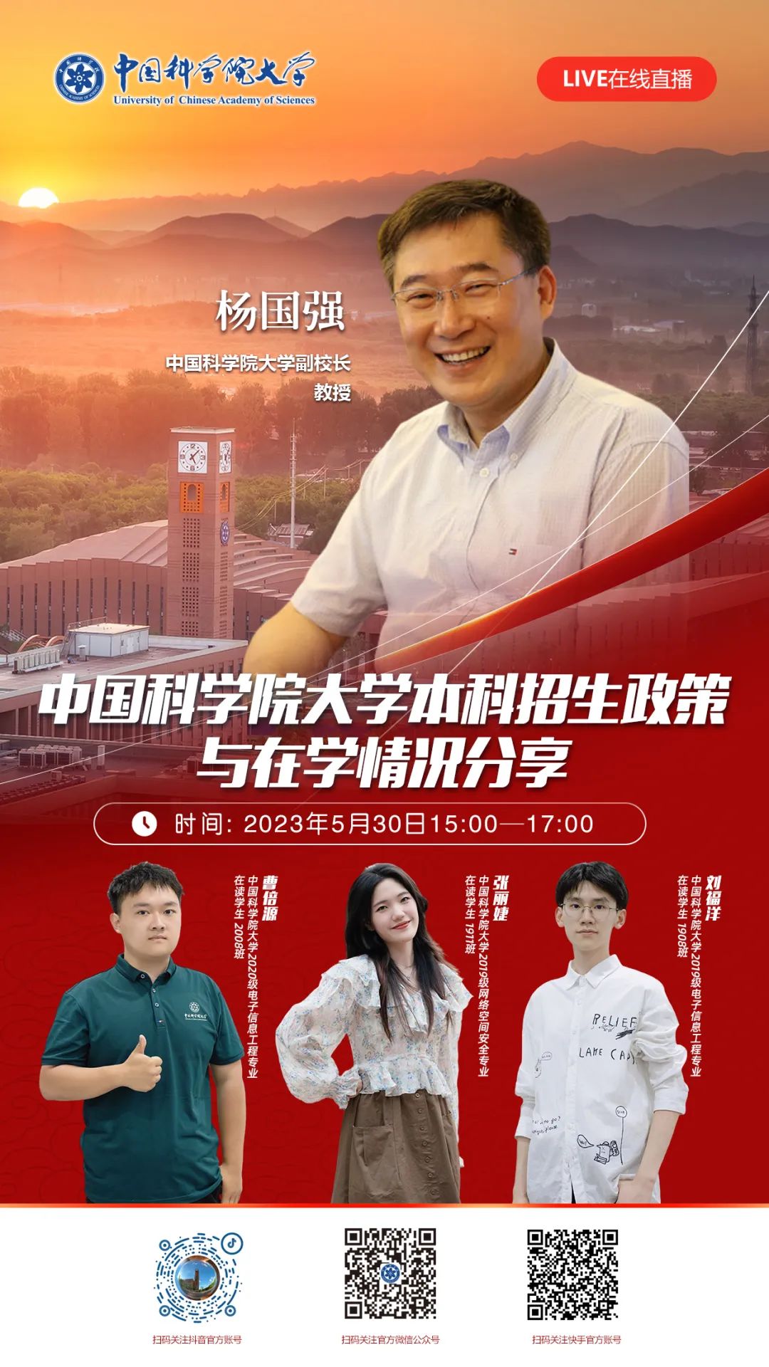 国科大将于5月30日(星期二)15:00,在抖音、快手官方账号开展直播。国科大副校长杨国强教授将介绍学校本科招生政策,曹倍源、张丽婕和刘福洋三位本科生将分享在读情况,一起来听!