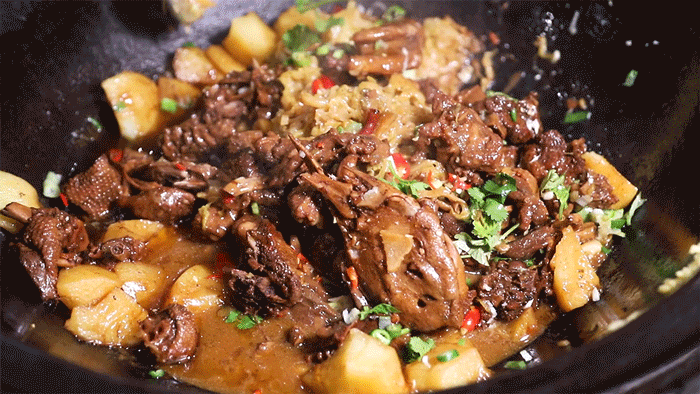 东北铁锅炖,食物种类丰富,有铁锅炖鱼、铁锅炖鹅等等一系列,以咸口为主,大家围着锅吃饭,连汤汁都泡了白饭吃,是东北人喜欢的味道。锅包肉