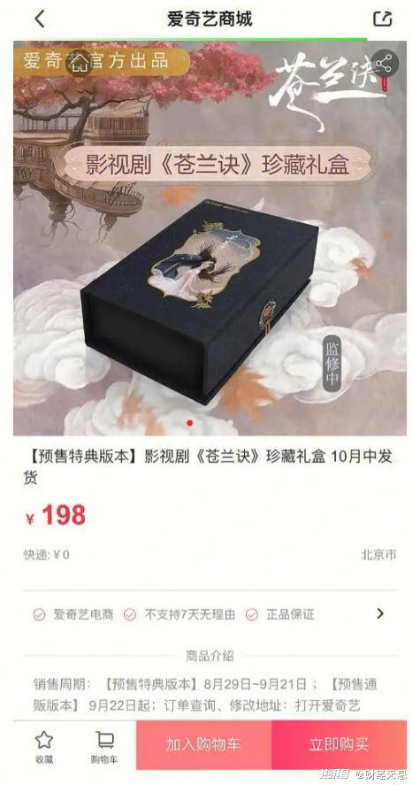 IP衍生品方面,如爱奇艺《苍兰诀》的198元珍藏礼盒,在爱奇艺商城成交记录超9万条,贡献毛收入约180万。