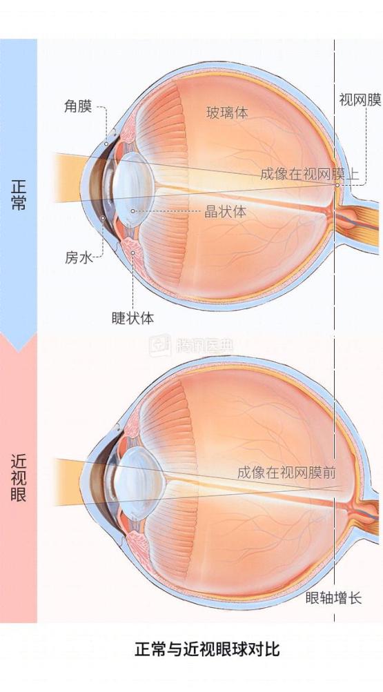 大多数近视是眼轴过长,进入你眼睛里的光线成像在视网膜之前,导致看东西不清晰。