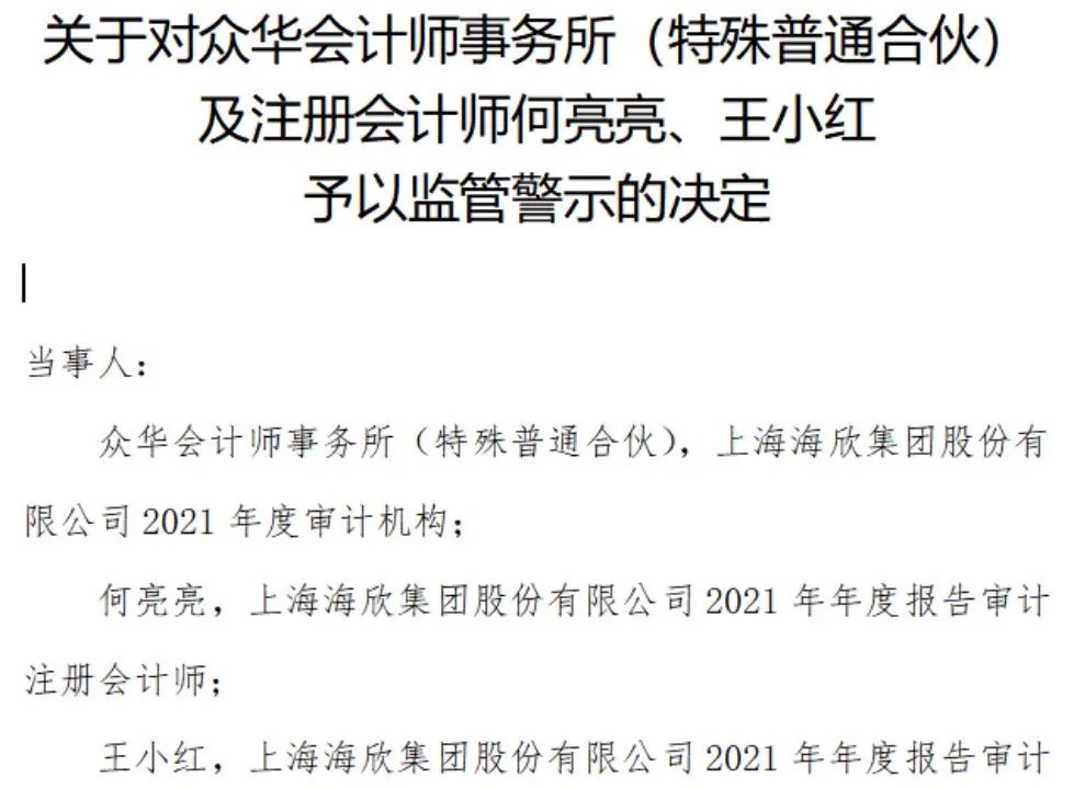 根据相关规定,上交所作出如下监管措施决定:对上海海欣集团股份有限公司2021年度审计机构众华会计师事务所(特殊普通合伙)及2021年年度报告审计注册会计师何亮亮、王小红予以监管警示。