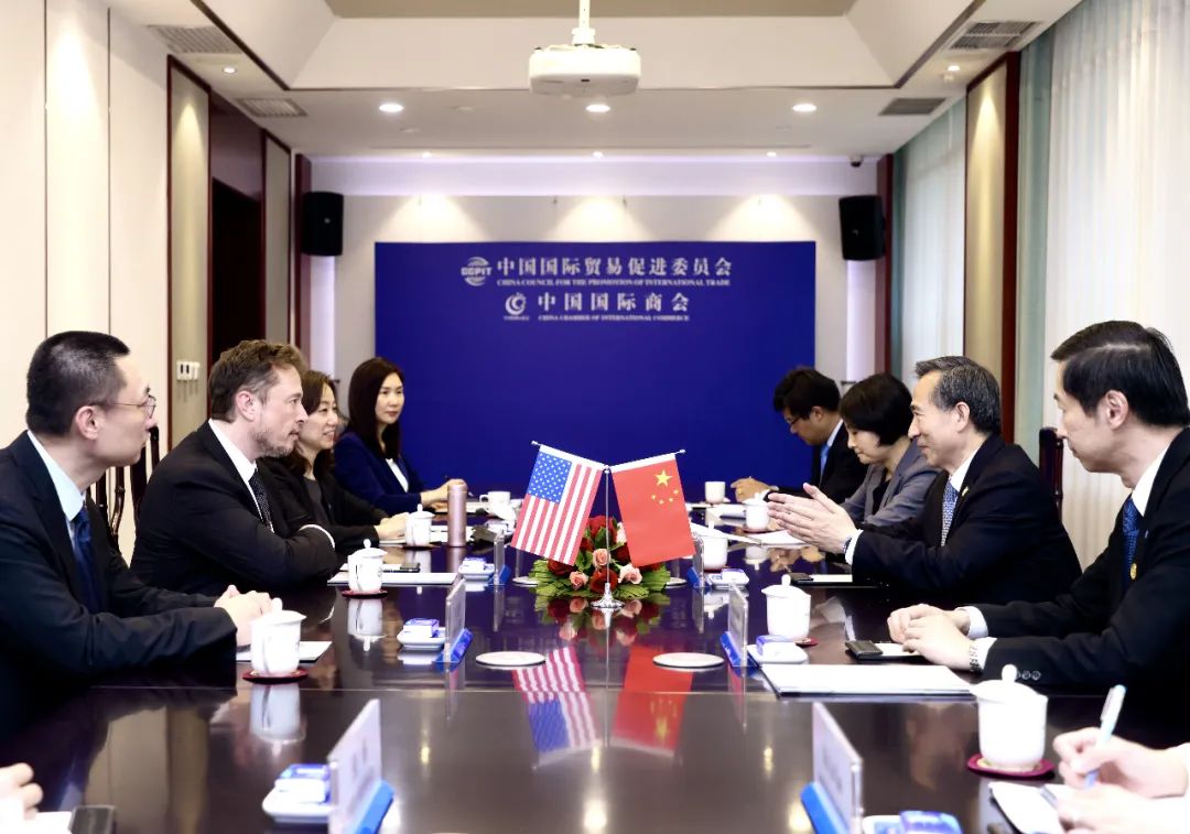 5月31日,中国贸促会会长任鸿斌会见特斯拉公司首席执行官埃隆·马斯克。双方就推动中美新能源产业合作、加强中美工商界交流合作、举办首届中国国际供应链促进博览会等议题深入交换意见。