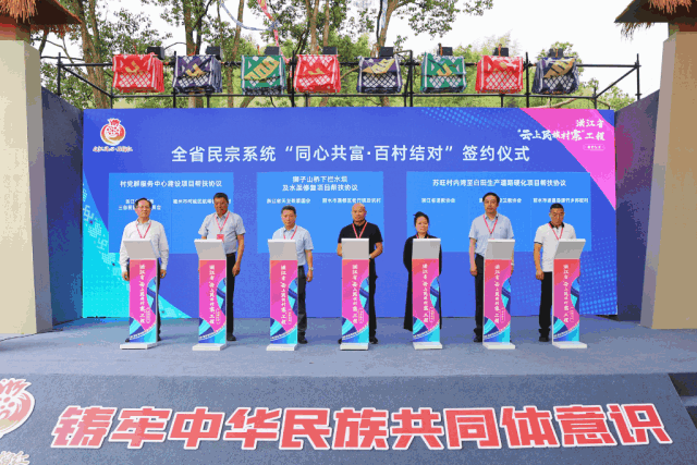 ▲ 浙江省“云上民族村寨”工程启动仪式启动仪式在《请到我家来坐坐》歌伴舞表演拉开序幕。省民宗委相关业务处室负责人介绍浙江省“云上民族村寨”工程工作,莪山畲族乡展示数字乡村应用场景。活动还进行了浙江民宗系统“同心共富·百村结对”签约仪式。