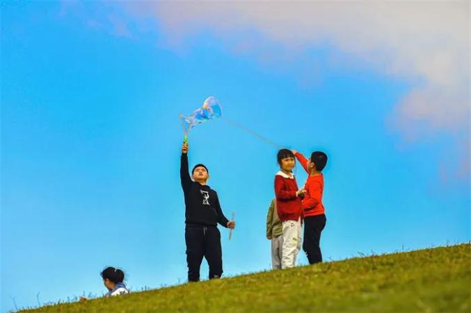在天蓝、地绿的海口美舍河凤翔湿地公园,小朋友聚在一起尽情嬉戏(资料图)。苏弼坤 摄