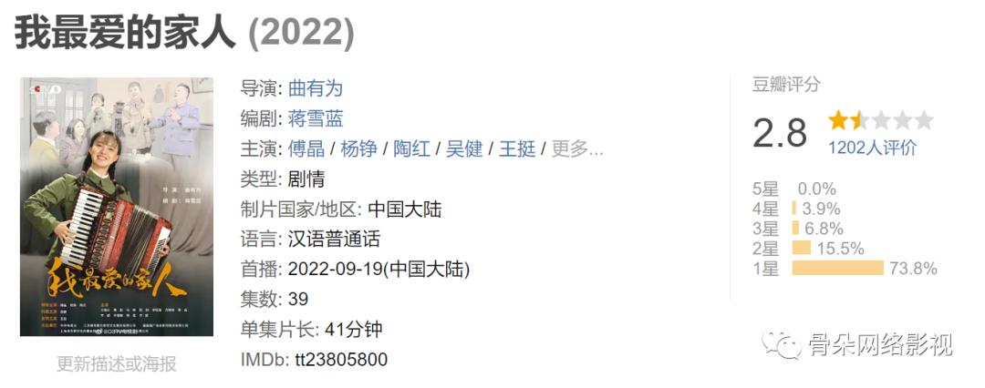 未开分的剧集类型以主旋律为主,《我最爱的家人》《亲爱的孩子们》之类家庭伦理剧,倒是都悉数开分,只是分数非常难堪。多部剧集仅有4-5分,《我最爱的家人》更是只有2.8分,几乎是这几年国产剧中评分垫底的水平。尽管这些剧集已经开分,但评分人数也仅在千人上下,看起来与电视台2%左右的高收视率完全无法匹配。