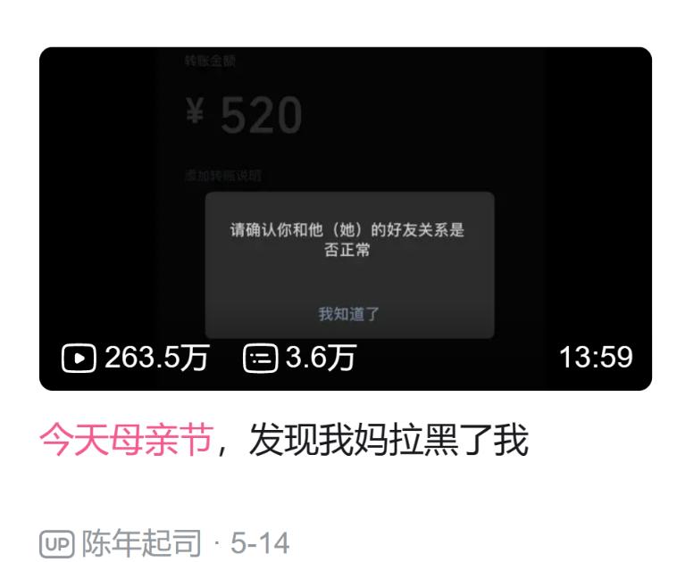 青年断亲现象越来越盛行,甚至包括与父母和亲生兄弟姐妹断绝来往。随着该现象日益加剧,在网上发表言论的90后和00后们纷纷举起了自己的声音。其中,B站up主“陈年起司”发布了视频《今天母亲节,发现我妈把我拉黑了》,哭诉自己曾遭到原生家庭的重男轻女之苦,父母多次区别对待弟弟和自己,最终导致自己与弟弟断绝来往。该视频已经播放超过两百万次,评论区年轻网友纷纷表示共鸣。