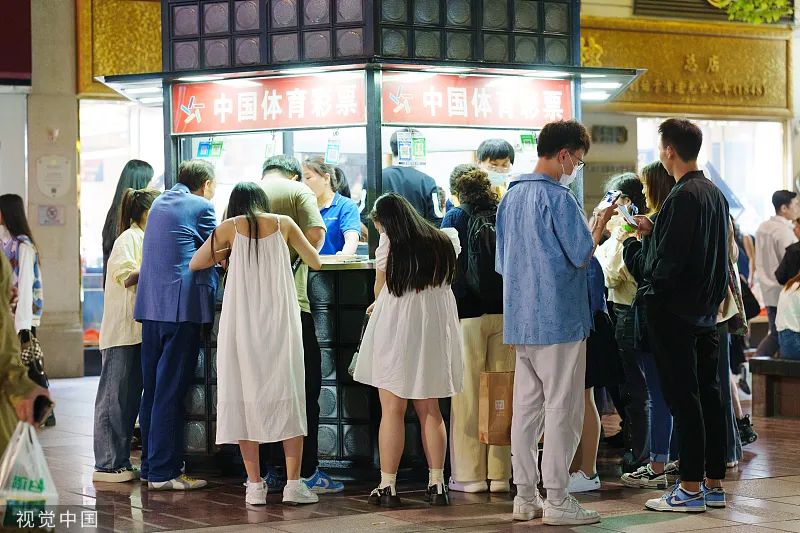 彩票亭前,挤满了人。(图/视觉中国)春天来了,人们从“躺平”中支棱起来,特种兵式地流动,去寺庙烧香,去淄博吃完烧烤,转身走到大街小巷里的福彩店或者彩票自助机,以主动的姿态,迎接生活里可能的小幸运。