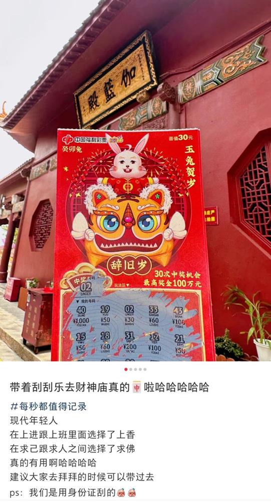 徘徊于寺庙与福彩店之间尽管年轻人买彩票,追求的是快节奏的即时反馈,其中却又毫不突兀地结合着佛系的价值观指导。