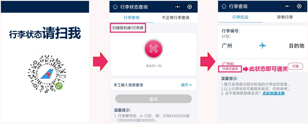 温馨提示使用微信,航班登机前2小时内,可查询广州