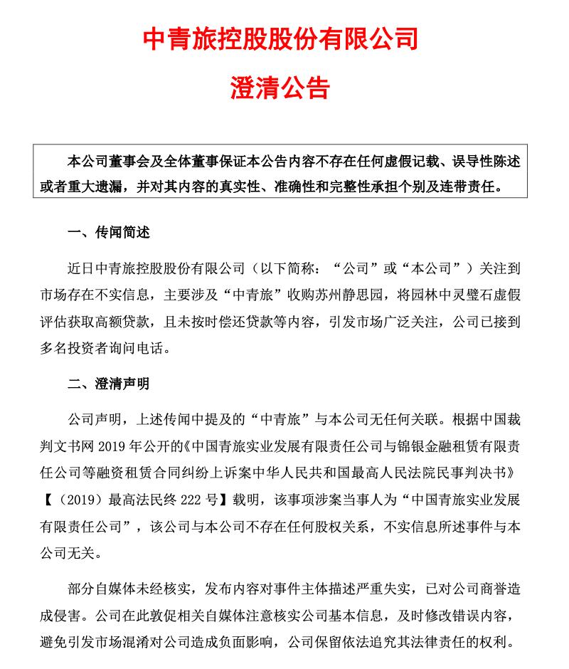 针对本次舆情,中青旅声明,上述传闻中提及的“中青旅”与本公司无任何关联。根据中国裁判文书网2019年公开的《中国青旅实业发展有限责任公司与锦银金融租赁有限责任公司等融资租赁合同纠纷上诉案中华人民共和国最高人民法院民事判决书》【(2019)最高法民终222号】载明,该事项涉案当事人为“中国青旅实业发展有限责任公司”,该公司与本公司不存在任何股权关系,不实信息所述事件与本公司无关。