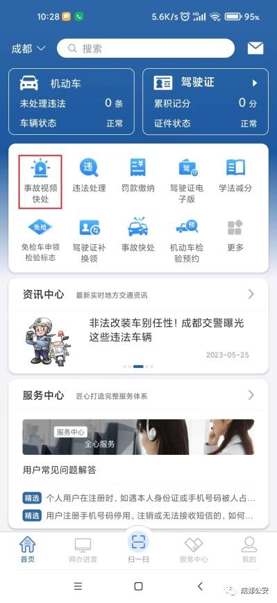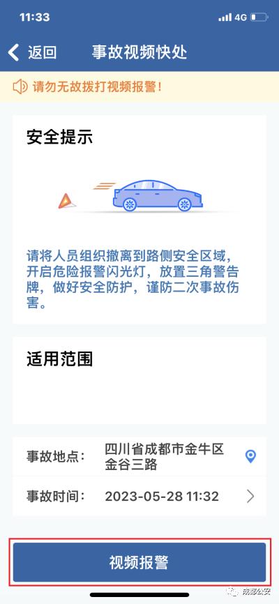 发生事故后,当事人在现场通过“交管12123”APP,点击【事故视频快处】功能模块,进行视频报警,系统自动定位事故地点信息。(成都交警温馨提示:目前我市支持事故视频快处的范围为武侯区、锦江区、高新区、龙泉驿区、彭州市。另外,您在使用视频报警时请共享定位,允许打开摄像头、麦克风!)
