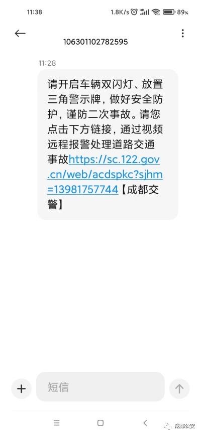 方法二:若无法下载“交管12123”APP,在拨打122报警后,点击四川公安或成都交警推送的视频报警短信链接,也可实现一键视频报警。