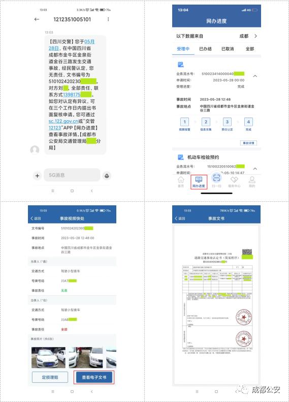 1.收到短信→2.点击首页【网办进度】→3.查看事故进度→4. 点击【查看电子文书】