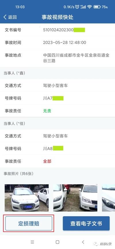 四、定损、理赔一键流转衔接当事人收到事故责任认定书后,车辆交强险投保公司为中国人保、中国太平洋、中国平安的,可点击“保险理赔”一键向所属保险公司报案,保险机构人员即刻与你联系。