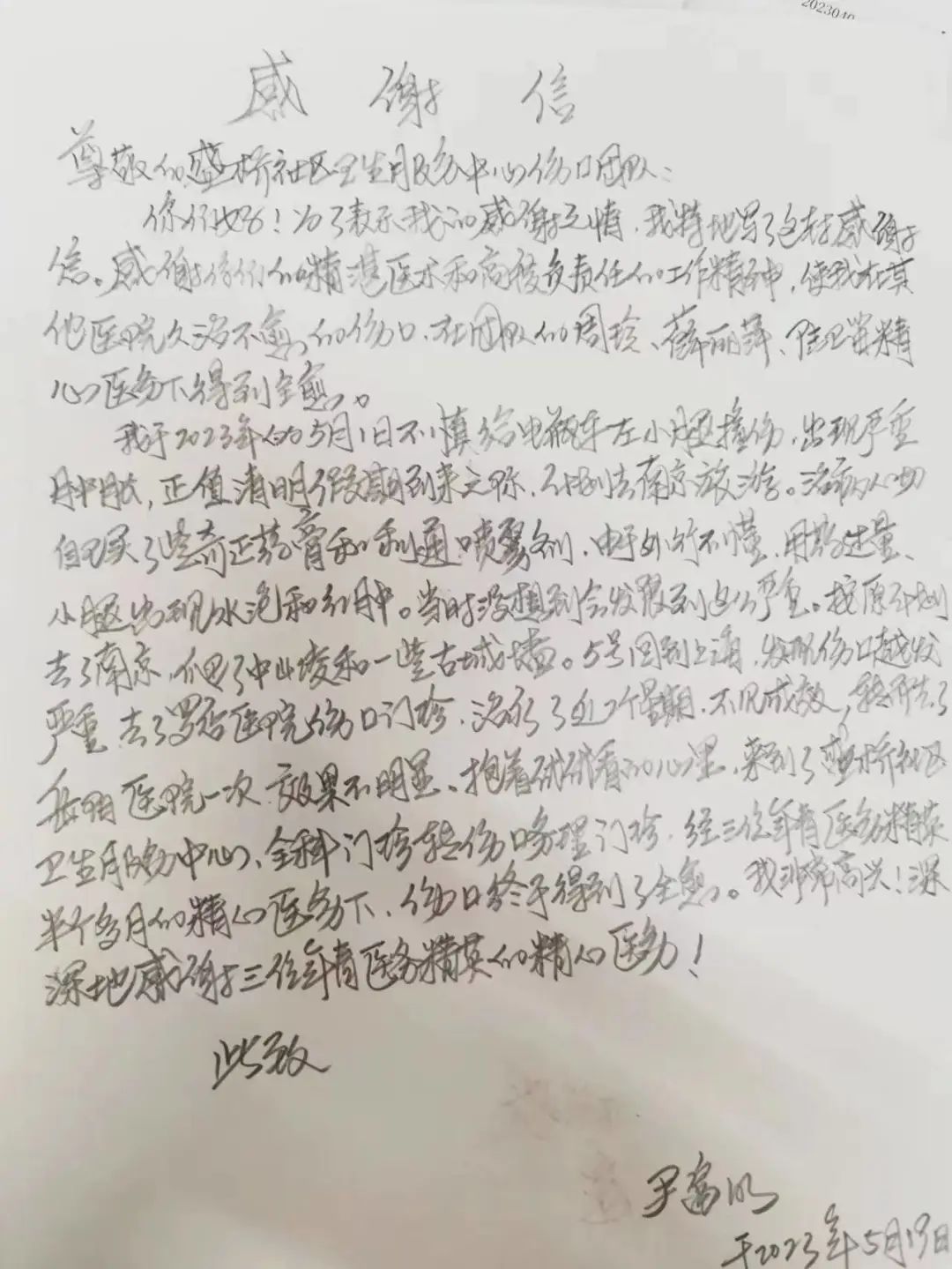 不久前,患者尹先生冒雨来到月浦镇盛桥社区卫生服务中心,为伤口护理门诊的护士们送来了感谢信,信中表达了他对伤口护理团队精湛技术和负责态度的赞扬和感谢。这封信也是该中心自今年2月开设伤口护理门诊后收到的诸多表扬信中的一封。
