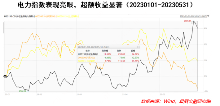 但在市场的普跌中,电力板块却逆势上扬,在整个5月,中证全指电力指数(H30199.CSI)上涨达5.49%,相比主要宽基指数,超额收益十分显著。全年来看电力表现也很亮眼,年初至今(20230101-20230531,下文同)涨幅达11.36%。一片惨淡的市场中,为何电力行业表现独树一帜?又该如何看待全年电力行业的机会与风险?