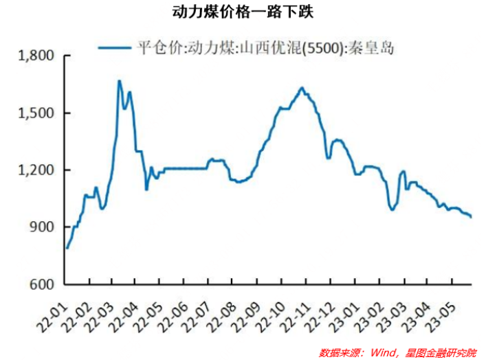 用于火力发电的部分,在发电供热用动力煤中长期合同机制建立后,市场逐步分割成长协煤和市场煤两部分,火力发电用煤的供给主要锁定在长协煤之中,因此目前非火电用煤需求成为了影响煤炭价格的主要因素。而2023年以来,地产价格的持续低迷,导致地产、基建相关用煤需求大幅度走弱,水泥、化工和钢铁的用煤需求开年至今一直维持疲弱。需求占比最小部分的煤化工用煤,相比去年同样也没有增长。因此在煤炭的需求面,非火电用煤的需求一直在减弱,导致市场煤的价格持续降低。市场煤价格的走弱又进一步影响煤炭长协价格的确定,进而利好火电企业的盈利情况。
