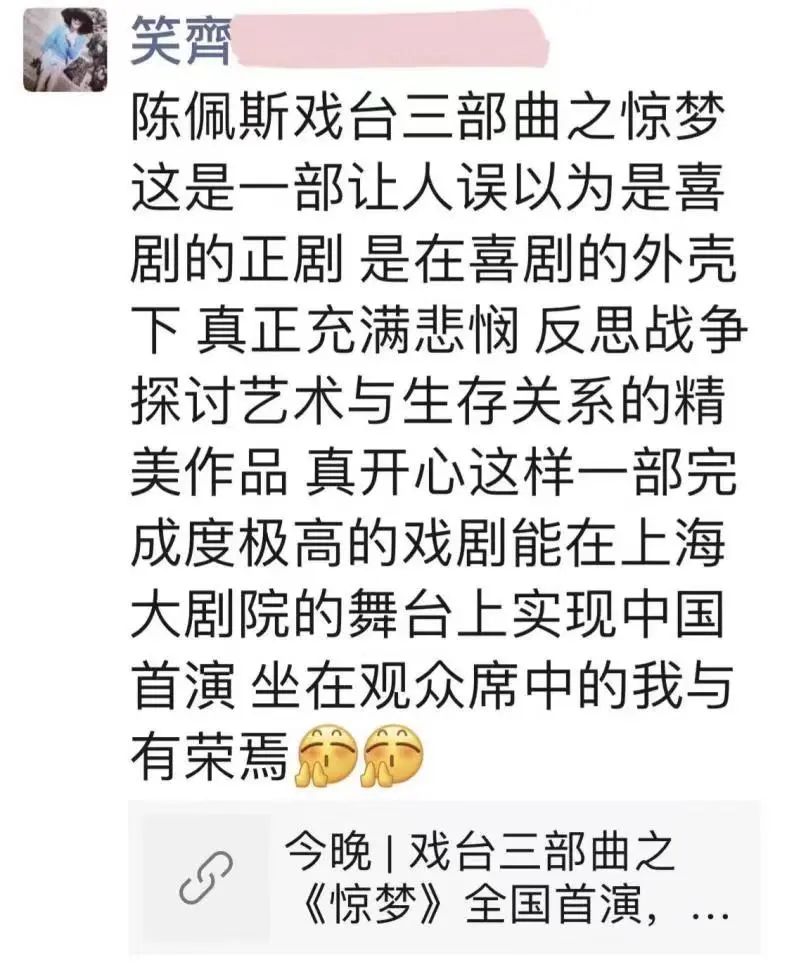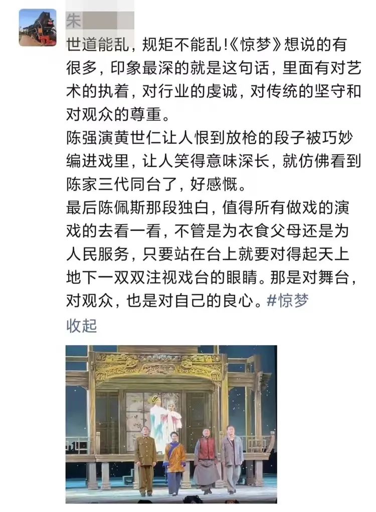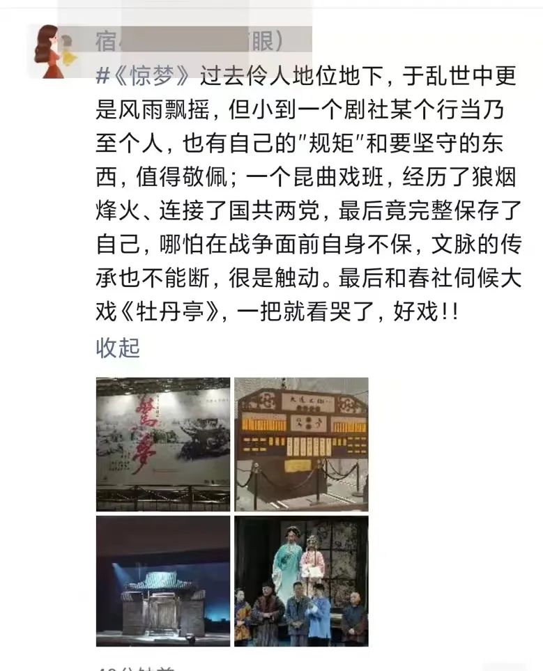 诸君的《戯臺》看过两遍,这次又得以学习《驚夢》,窃以为两戏虽风格不同,俱是佳作。《戯臺》笑中带泪,《驚夢》更多悲悯,而尺寸的拿揑均极显功力,节奏之张弛也恰到好处。《驚夢》的舞美和灯光都是大手笔,真有如梦如幻,且于无声处听惊雷之感,与剧本和表演浑然天成于一体。