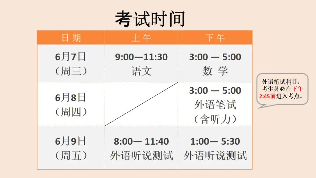 一、考生必须按规定时间参加考试。每科开考至少45分钟前凭准考证和有效证件原件(有效证件含:居民身份证、有照片的社保卡、驾驶证、护照、军人证)接受按规定进行的安检后进入考点。语文科目考试在开考后15分钟(上午9:15)禁止考生进入考点考试;数学科目考试在开考后15分钟(下午3:15)禁止考生进入考点考试;外语科目考试考前15分钟(下午2:45)禁止考生进入考点考试。考生可在开考前30分钟进入考场。