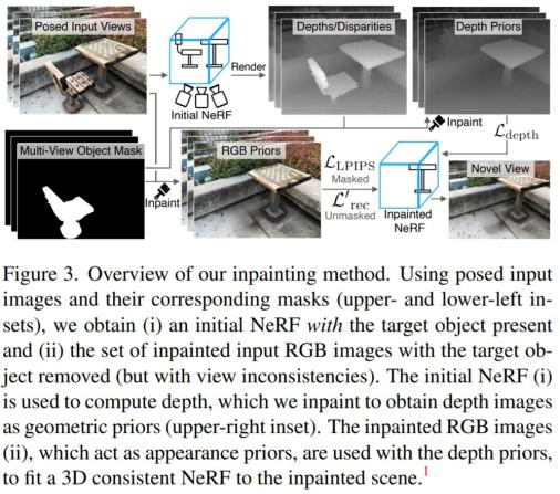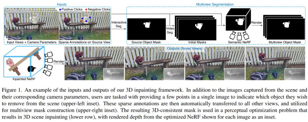 研究者利用现成的、无 3D 的模型进行分割和图像修复,并以视图一致性的方式将其输出转移到 3D 空间。建立在 2D 交互式分割工作的基础上,作者所提出的模型从一个目标对象上的少量用户用鼠标标定的图像点开始。由此,他们的算法用一个基于视频的模型初始化掩码,并通过拟合一个语义掩码的 NeRF ,将其训练成一个连贯的 3D 分割。然后,再应用预先训练的二维图像修复到多视图图像集上,NeRF 拟合过程用于重建三维图像场景,利用感知损失去约束 2 维画图像的不一致,以及画深度图像规范化掩码的几何区域。总的来说,研究者们提供了一个完整的方法,从对象选择到嵌入的场景的新视图合成,在一个统一的框架中对用户的负担最小,如下图所示。