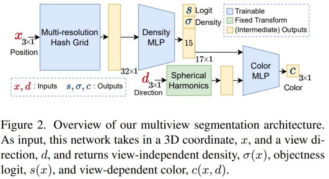 多视图分割模块获取输入的 RGB 图像、相应的相机内在和外部参数,以及初始掩码去训练一个语义 NeRF 。上图描述了语义 NeRF 中使用的网络;对于点 x 和视图目录 d,除了密度 σ 和颜色 c 外,它还返回一个 pre-sigmoid 型的对象 logit,s (x)。为了其快速收敛,研究者使用 instant-NGP 作为他们的 NeRF 架构。与光线 r 相关联的期望客观性是通过在等式中呈现 r 上的点的对数而不是它们相对于密度的颜色而得到的:然后使用分类损失进行监督: