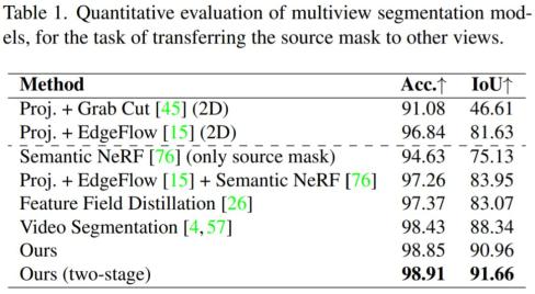 多视图分割:首先评估 MVSeg 模型,没有任何编辑修复。在本实验中,假设稀疏图像点已经给出了一个现成的交互式分割模型,并且源掩码是可用的。因此,该任务是将源掩码传输到其他视图中。下表显示,新模型优于 2D(3D 不一致)和 3D 基线。此外研究者提出的两阶段优化有助于进一步改进所得到的掩码。