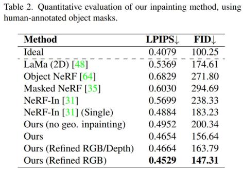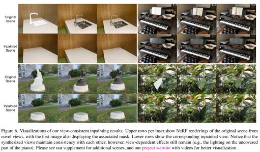 该研究还通过训练一个很有挑战性的现实场景的数据集,给评估三维场景内修复方法带来了新的基准测试。特别是,该数据集包含了有或没有目标对象的同一场景的视图,从而使三维空间内修复任务能够进行更有原则的基准测试。