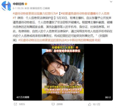 与以往不同的是,这一次,部分明星艺人加入了讨论,对反虐待动物的主张进行公开声援。不久,这些明星的隐私被接二连三地曝光,包括身份证、社保信息以及居住地址等诸多个人信息。舆论普遍分析,这是虐待动物团体的报复,并借机炫耀他们的能量和胆量,可能还有对动物保护主义者的威胁意味。