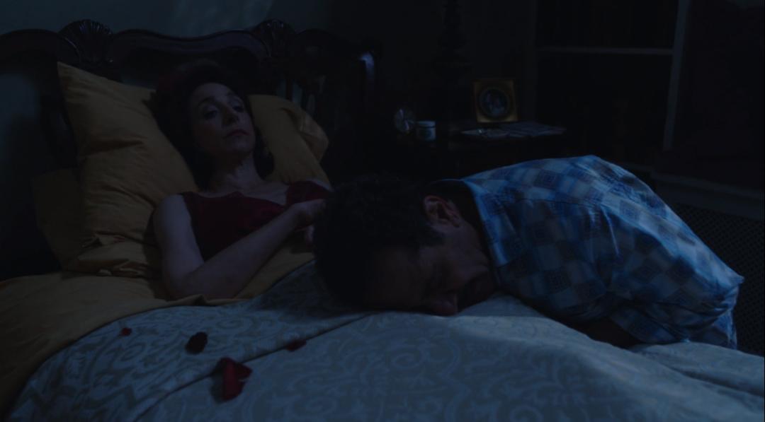 巧合的是,剧作者本人就坐在隔壁饭桌,证实话剧讲的就是小男孩失去宠物狗的故事。随后一整晚,安比在妻子面前一言不发,权威感的丧失击碎了他。直到深夜他从床上起身,把头埋在妻子的胸口,既是道歉也是乞怜。这个愿意袒露脆弱的时刻,成了安比全剧最可爱的时刻。而妻子接过他的脆弱,轻轻地摸了他的头。