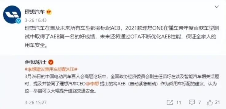 在去年,理想汽车 CEO 李想曾建议乘用车标配 AEB,引来了业界大咖们的一致赞同。