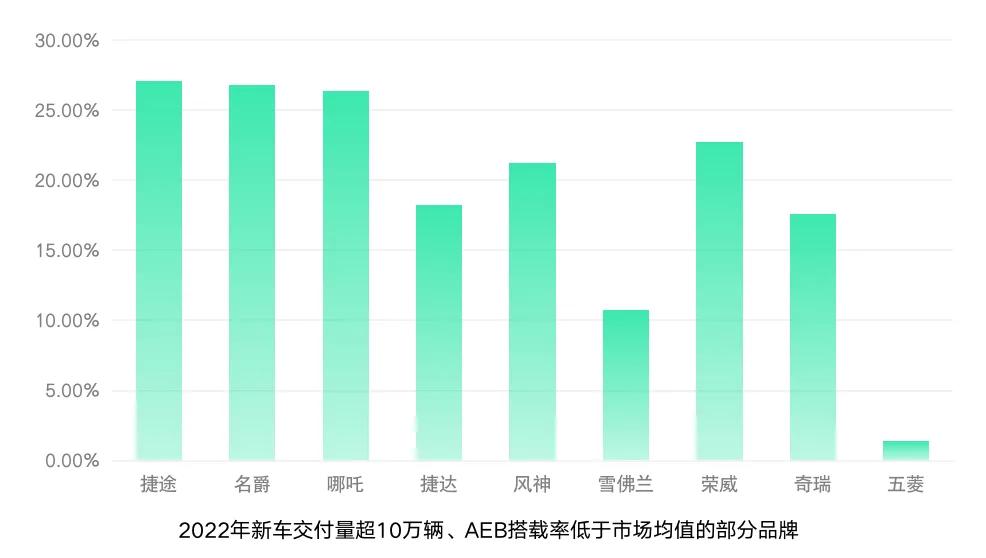 根据高工智能汽车研究院的数据,2022 年国内市场上,35 万元以上价位车型 AEB 搭载率已经超过 90% ,20 - 35 万区间搭载率也有 70% 以上,然而 10 - 15 万元的搭载率只有 34.95% ,10 万元以下更是只有 2.27% 。