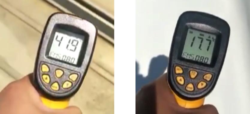 △普通钢结构表面温度(左) α硅烷涂料表面温度(右)适用范围: