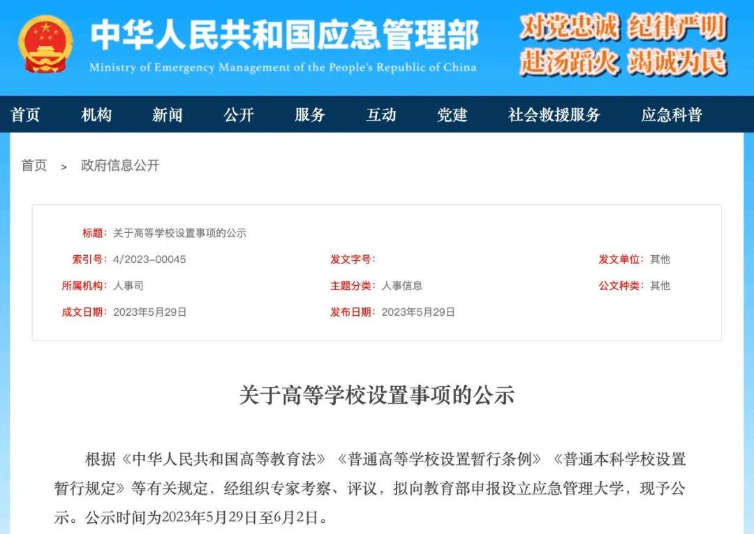 5月29日,应急管理部官网发布一则《关于高等学校设置事项的公示》。根据该公示,应急管理部将以华北科技学院、防灾科技学院为建校基础,合并设立新的应急管理大学,办学地点在河北省廊坊市,性质为全日制公办普通大学。