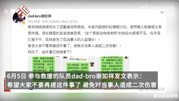 另据@九派新闻 报道,6月5日,参与救援的队员@dad-bro谢如祥 在微博发文称:“有些网络自媒体为了流量真没有底线,本是内部群的吐槽和讨论,居然被人断章取义恶意传播……希望大家不要再提这件事了,避免对当事人造成二次伤害!拜托了,这件事已经结束了!”