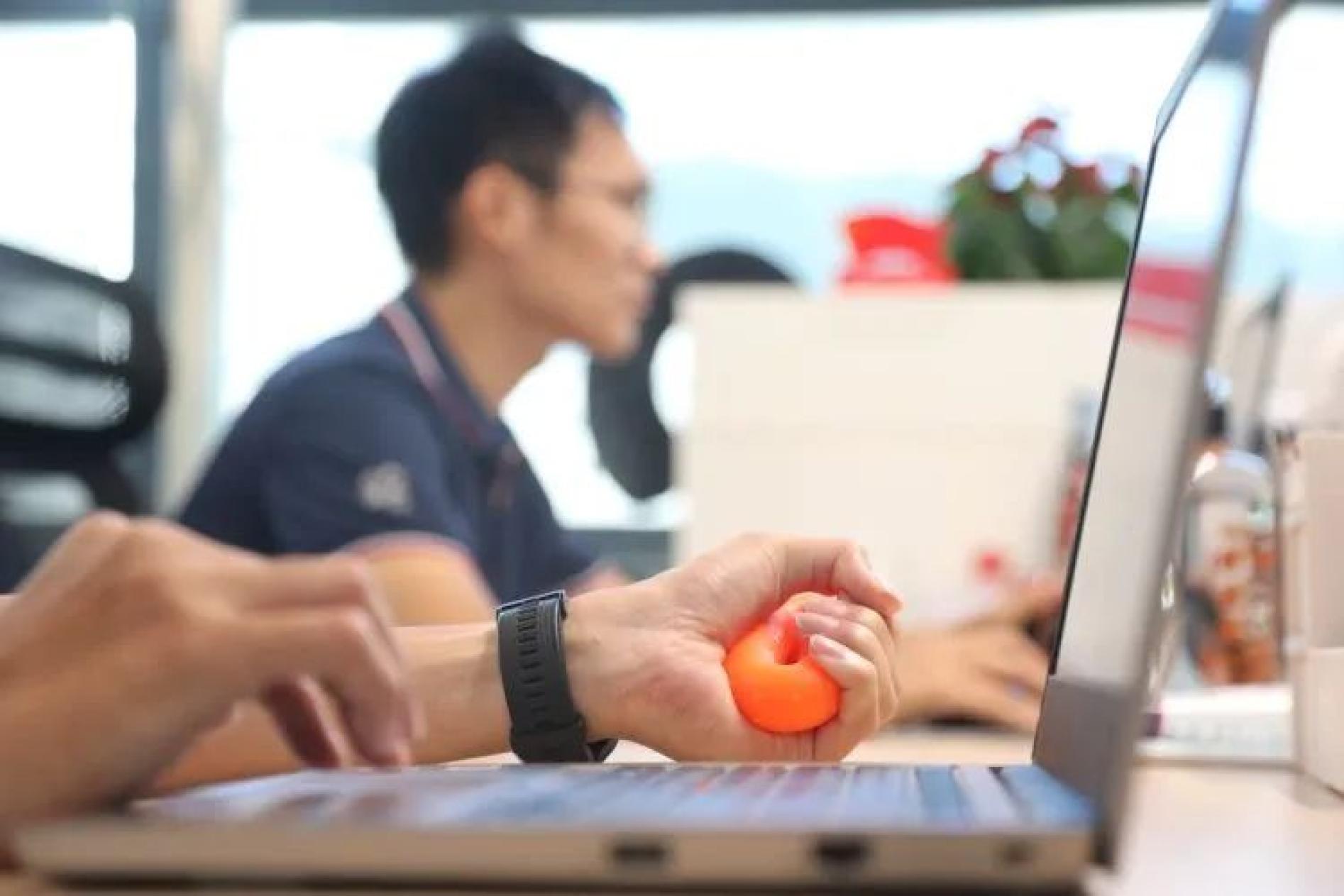 站立办公:鼓励公司职工进行站立办公,减少肩颈劳损及久坐造成的身体健康隐患。碎片化运动:为每位职工提供了个人运动包,包含弹力带、握力器和筋膜球,便于职工在工位上进行减压运动。