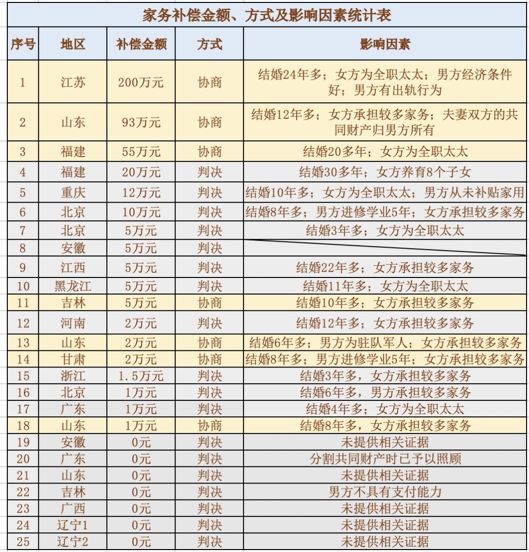 从上面的统计表来看,像“200万元”的巨额家务补偿金一般情况下只能通过双方协商,另一方自愿支付的方式才能实现。如果由法院判决的话,家务补偿金额一般不超过10万元,法院会综合考虑结婚年限、双方经济情况、家务劳动强度、一方因家务劳动丧失的机会成本等因素判决家务补偿金额。