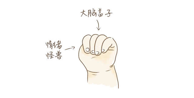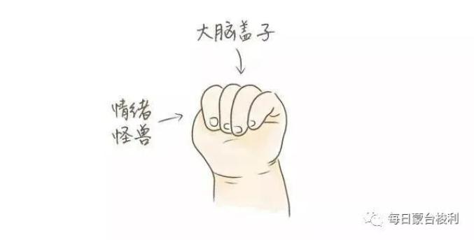 我们的大脑,就像一个拳头,大拇指是最可怕的情绪怪兽,另外四个指头是″大脑盖子″。当我们平静时,大拇指放在手心里握成拳头,″大脑盖子″是合上的,情绪怪兽也就被关在里面。