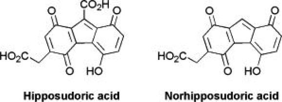 (图源wiki)京都药科大学的Kimiko Hashimoto及其同事分离出了导致这种颜色反应的2种主要色素,红色的称为河马汗酸(hipposudoric acid),橘色的则称为正河马汗酸(norhipposudoric acid),二者兼具防晒和抗菌的功能:河马汗酸具有很强的光吸收能力,可以吸收可见光和200纳米到600纳米之间的紫外线;河马汗酸能抑制致病菌绿脓杆菌(Pseudomonas aeruginosa)A3和克雷伯氏肺炎菌(Klebsiella pneumoniae)的生长。