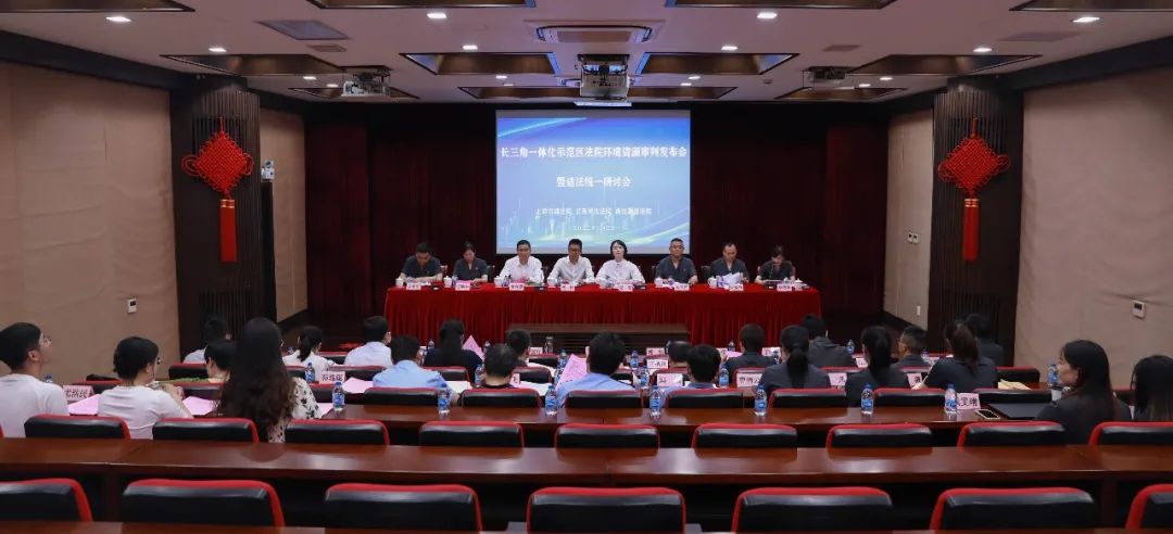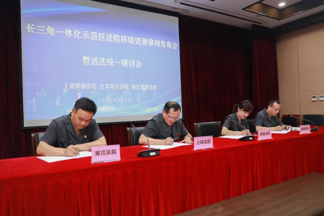 为充分发挥人民法院环境资源审判作用,服务保障长三角生态绿色一体化示范区建设,6月2日下午,由上海市青浦区人民法院、苏州市吴江区人民法院、浙江省嘉善县人民法院共同主办的“长三角一体化示范区法院环境资源审判发布会暨适法统一研讨会”在上海市青浦区朱家角镇一体化示范区执委会报告厅举行。三地司法执法机关、人大代表及专家学者齐聚一堂,共同开展理论探讨和实务研究。