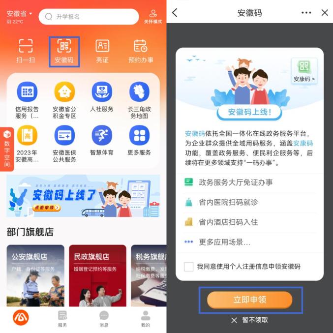 “安徽码”已在皖事通、皖政通中发布,用户可通过“皖事通”App、“皖政通”App、皖事通支付宝小程序等渠道申领使用。