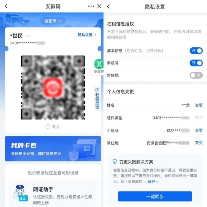 03完成身份认证后,即可进入“安徽码”页面。点击“隐私设置”,还可以根据需要设置您的“安徽码”被扫码后能获取的信息。