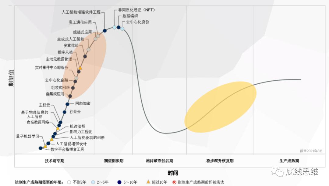 根据N曲线的斜率与拐点,分为明显的:科技诞生期(Innovation Trigger)、泡沫巅峰期(Peak of Inflated Expectations)、泡沫破裂低谷期(Trough of Disillusionment)、稳步爬升期(Slope of Enlightenment)、规模应用期(Plateau of Productivity)五个阶段。