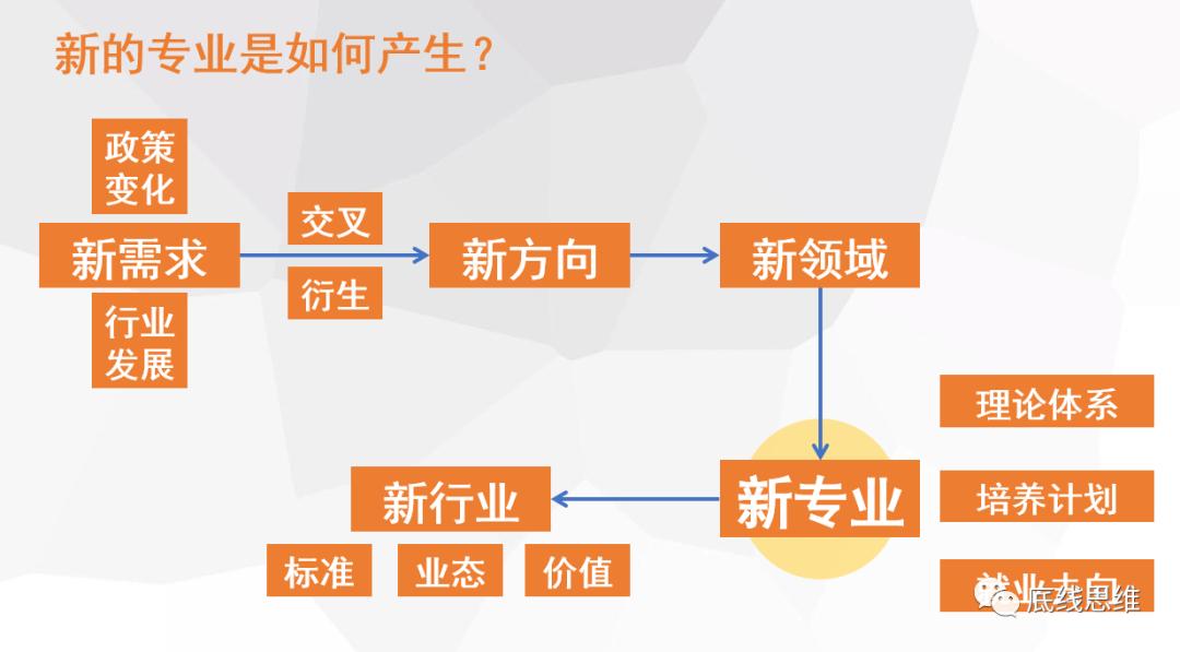 在新增专业中还有一类“自立门户”的专业,如“密码学“、”慈善管理“、”行星科学”。这也正是由于新行业的产生。其实不仅仅是泛理工科领域,在经管学科、社会科学学科也同样可以在时代发展的重点领域得到同样的发展机遇。在我们讨论高考志愿时,我们的视角是“大学和专业”,而在职业发展时,其实我们的视角是“行业和岗位”。比如一位市场营销专业的学生,在高考填报志愿时,所看重的是名牌大学的金子招牌,然而在未来职业发展时,决定其收入和社会地位的最主要因素是行业赛道。同样是市场品牌岗位,新能源汽车和教培赛道的人才素质要求类似,但是未来预期却截然不同。