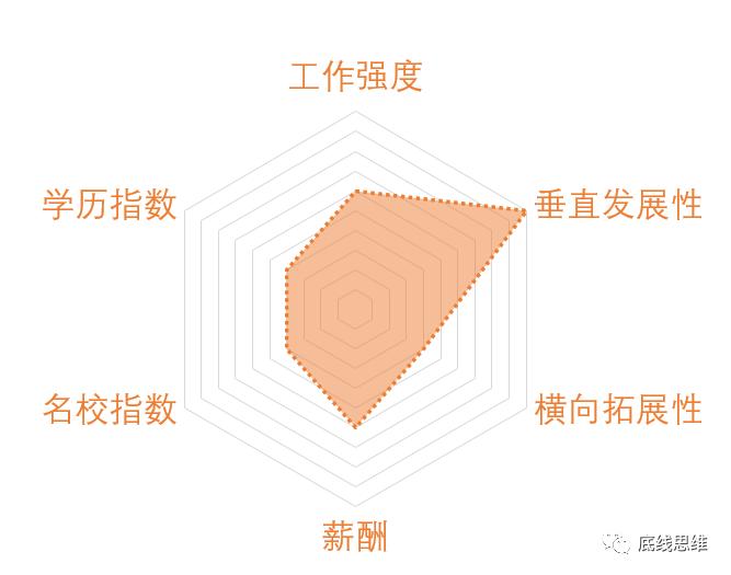 当然,仅仅从稳定性上分析是不够的,笔者通过此前分析专业的六维分析方法来衡量一个专业/行业的特点:在这个分析中,从六个维度来评价一个专业。具体分为了三个方面:幸福感(薪酬、工作强度)成就感(垂直发展性、生涯多样性)精英感(名校指数、学历指数)。