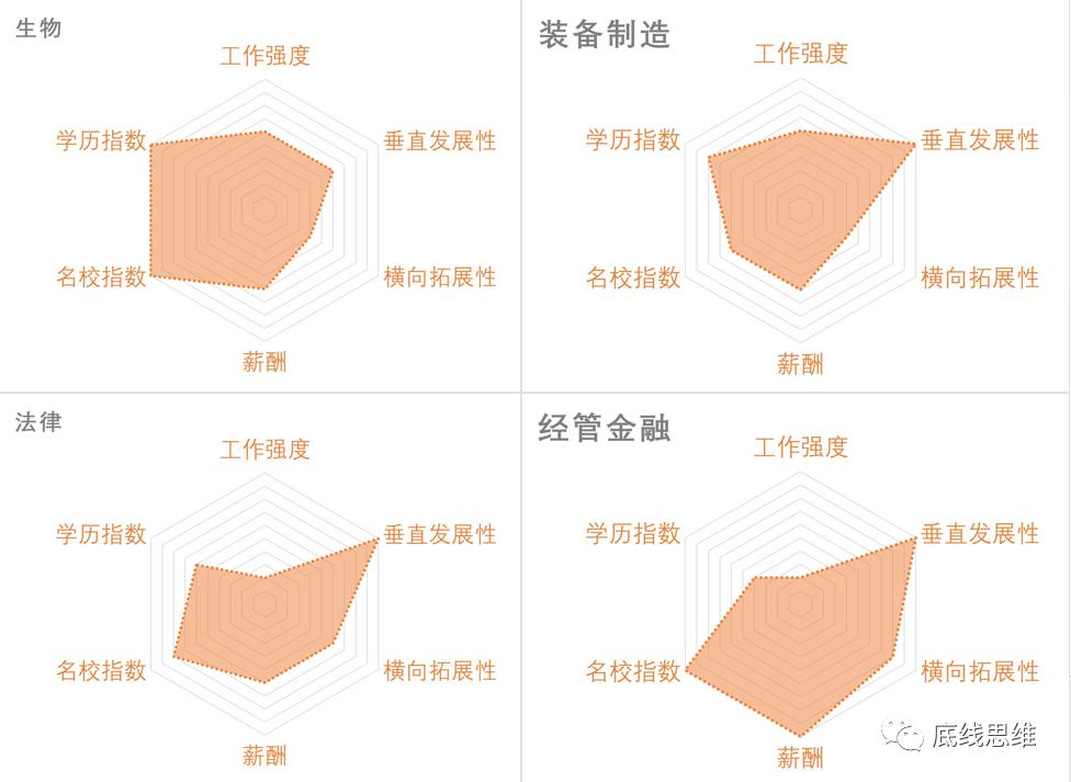 这也就构成了当下几乎是专业的基准,其他专业与之比较,雷达图右半边面积越大,说明发展性越好,而左半边越大,则说明需要有名校和高学历的加持,需要在学业上付出的努力更多。